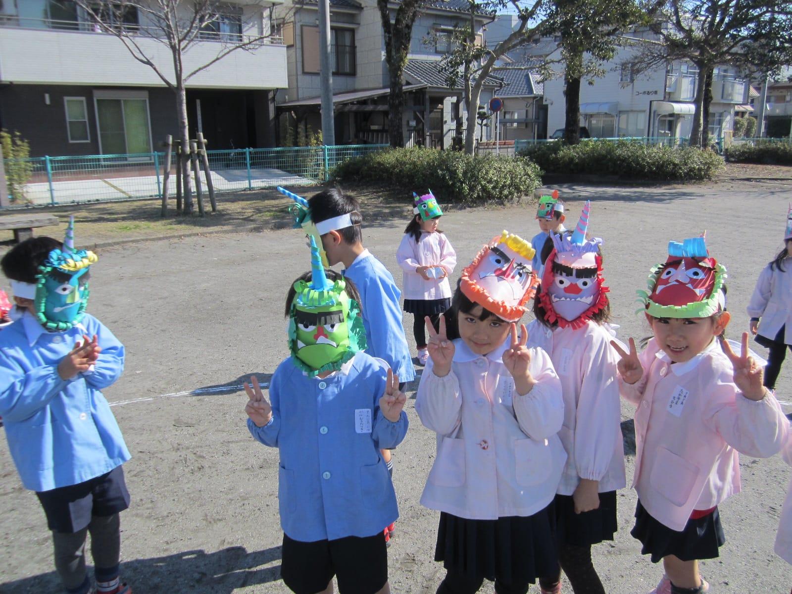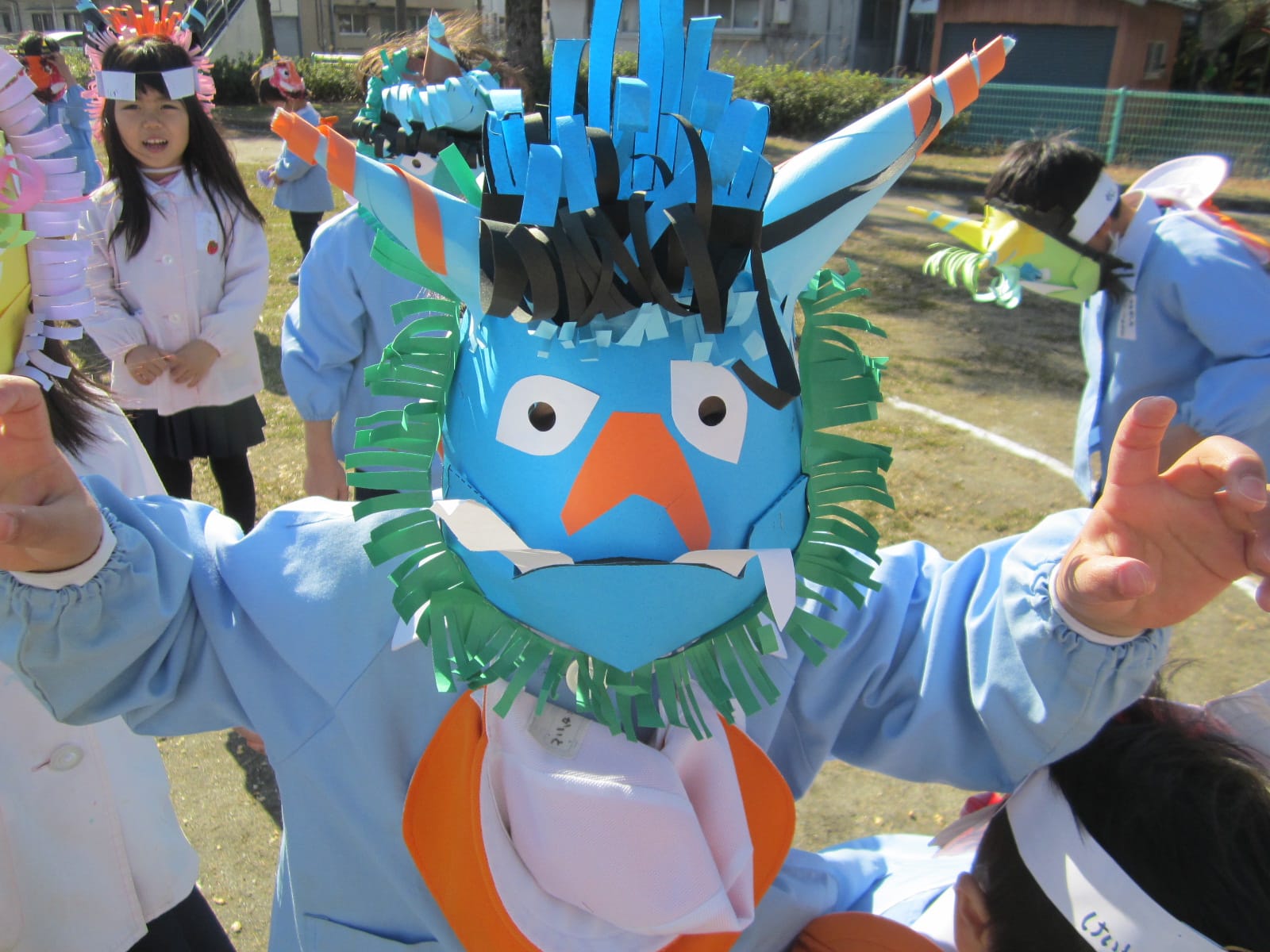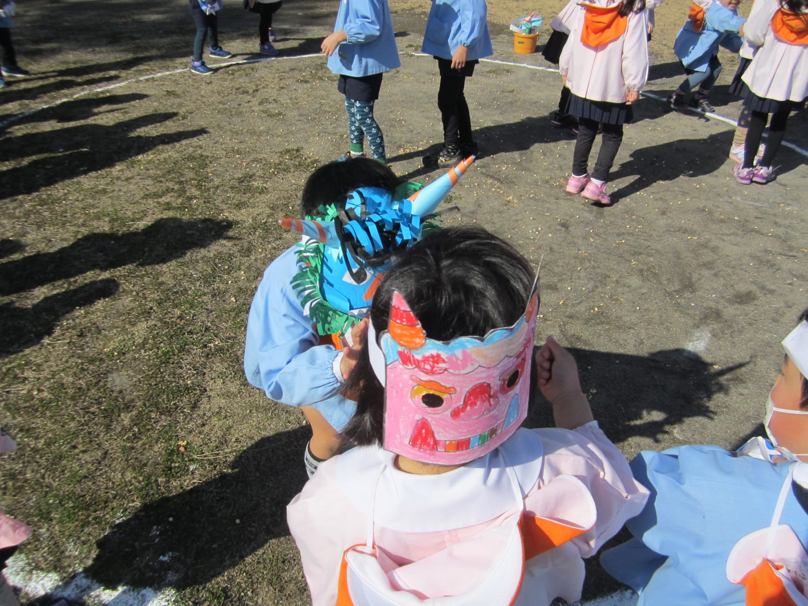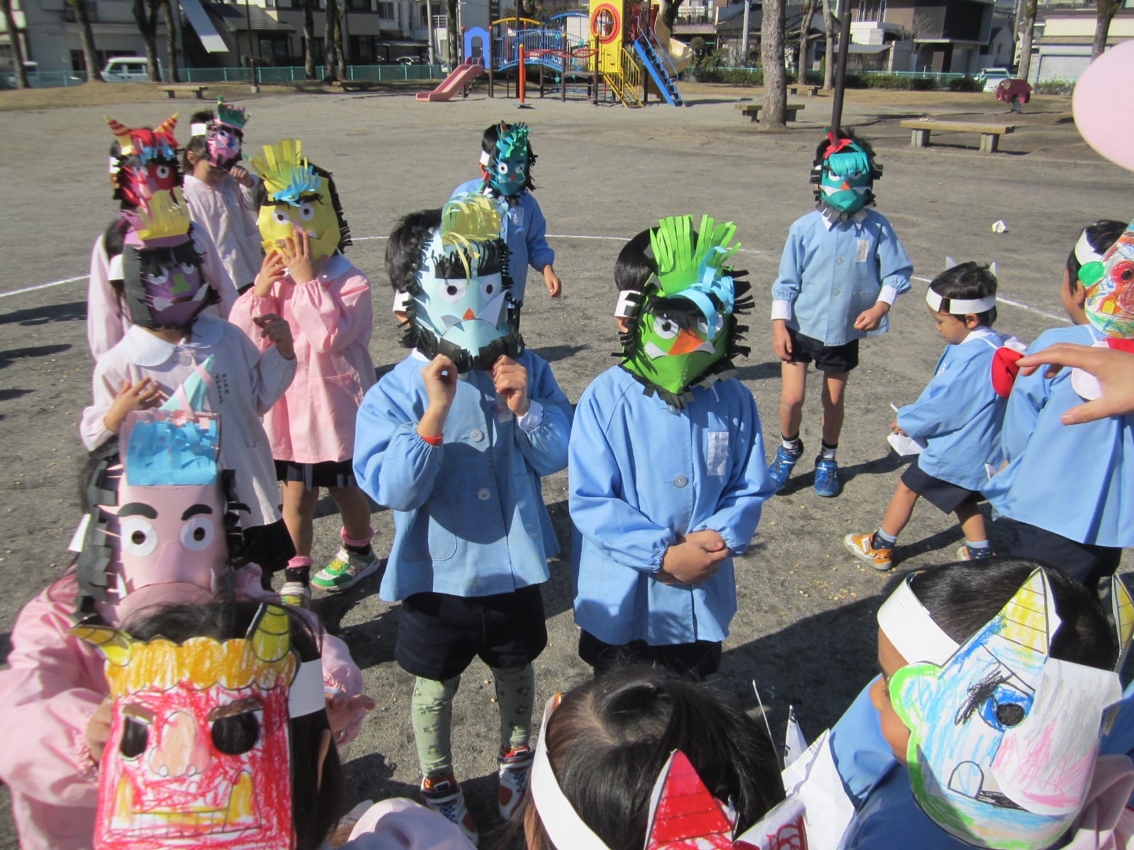 節分 ひまわりブログ2015.02.09色とりどりのおにのお面をつけた子どもたちが大集合!「おには外! 福は内!」去年の豆まきでは、おにが登場すると怖がっていたCさん・Dさんも、今年は、おにのお面をつけて豆まきをしました。経験を重ねるごとに、大きく成長している子どもたち!自分の中に住んでいる“泣き虫おに”“わがままおに”“おこりんぼうおに”を追い出せたかな? 7
