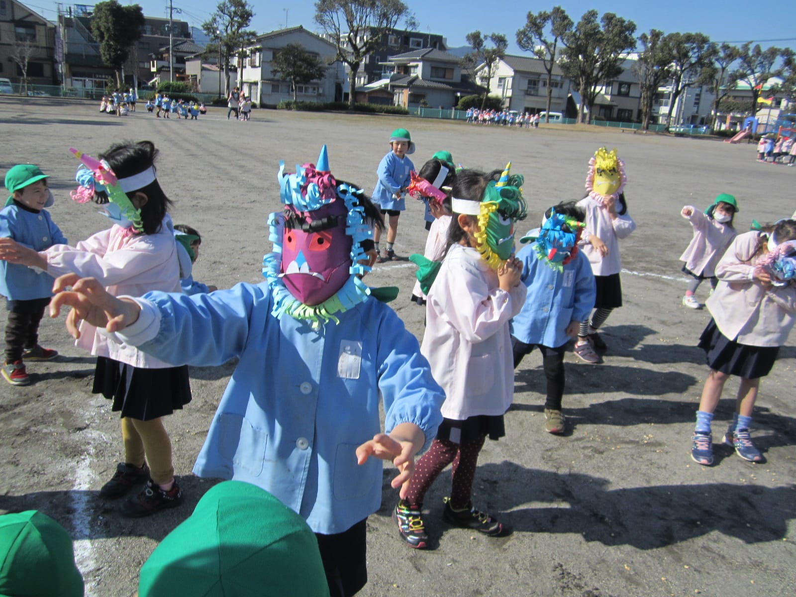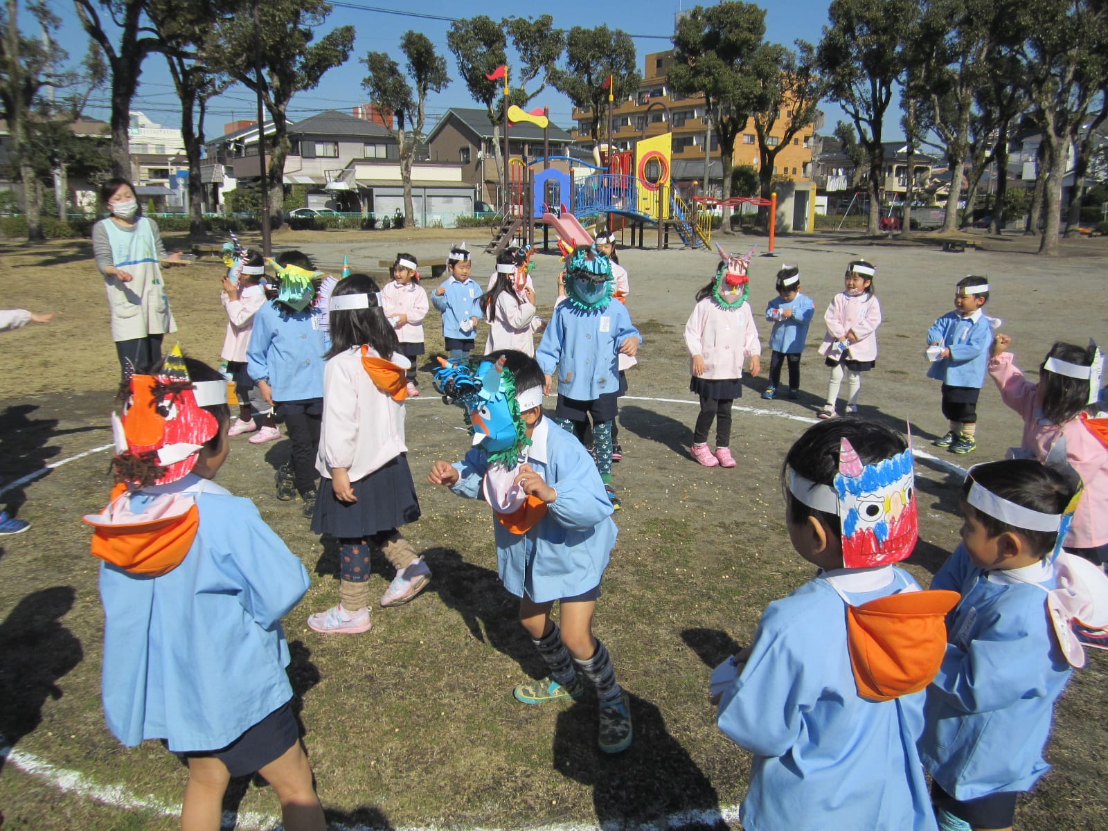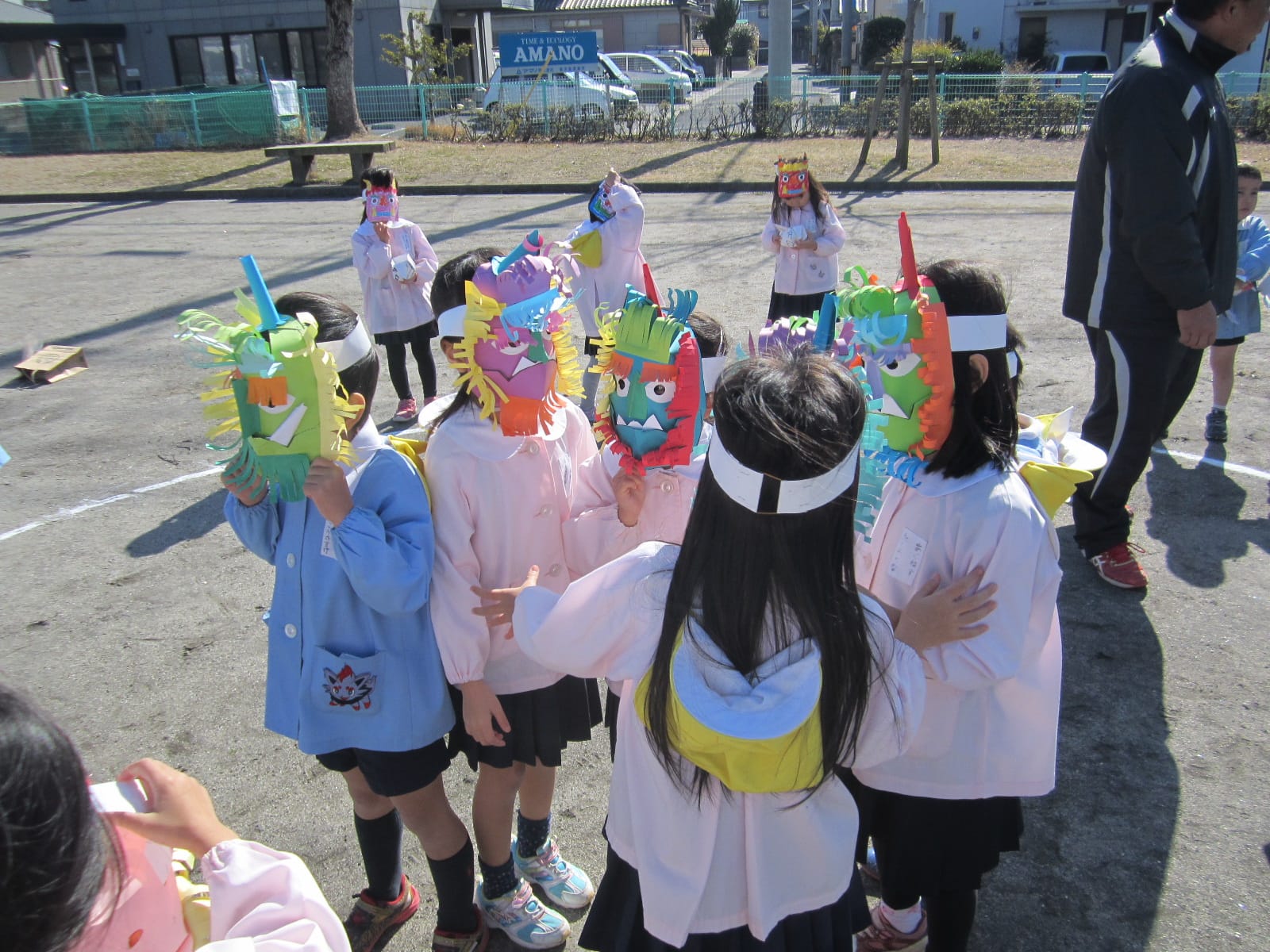 節分 ひまわりブログ2015.02.09色とりどりのおにのお面をつけた子どもたちが大集合!「おには外! 福は内!」去年の豆まきでは、おにが登場すると怖がっていたCさん・Dさんも、今年は、おにのお面をつけて豆まきをしました。経験を重ねるごとに、大きく成長している子どもたち!自分の中に住んでいる“泣き虫おに”“わがままおに”“おこりんぼうおに”を追い出せたかな? 7