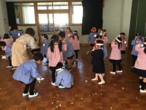 豆まきの歌やお遊戯を楽しんだ後、さあ!豆まきの始まり!