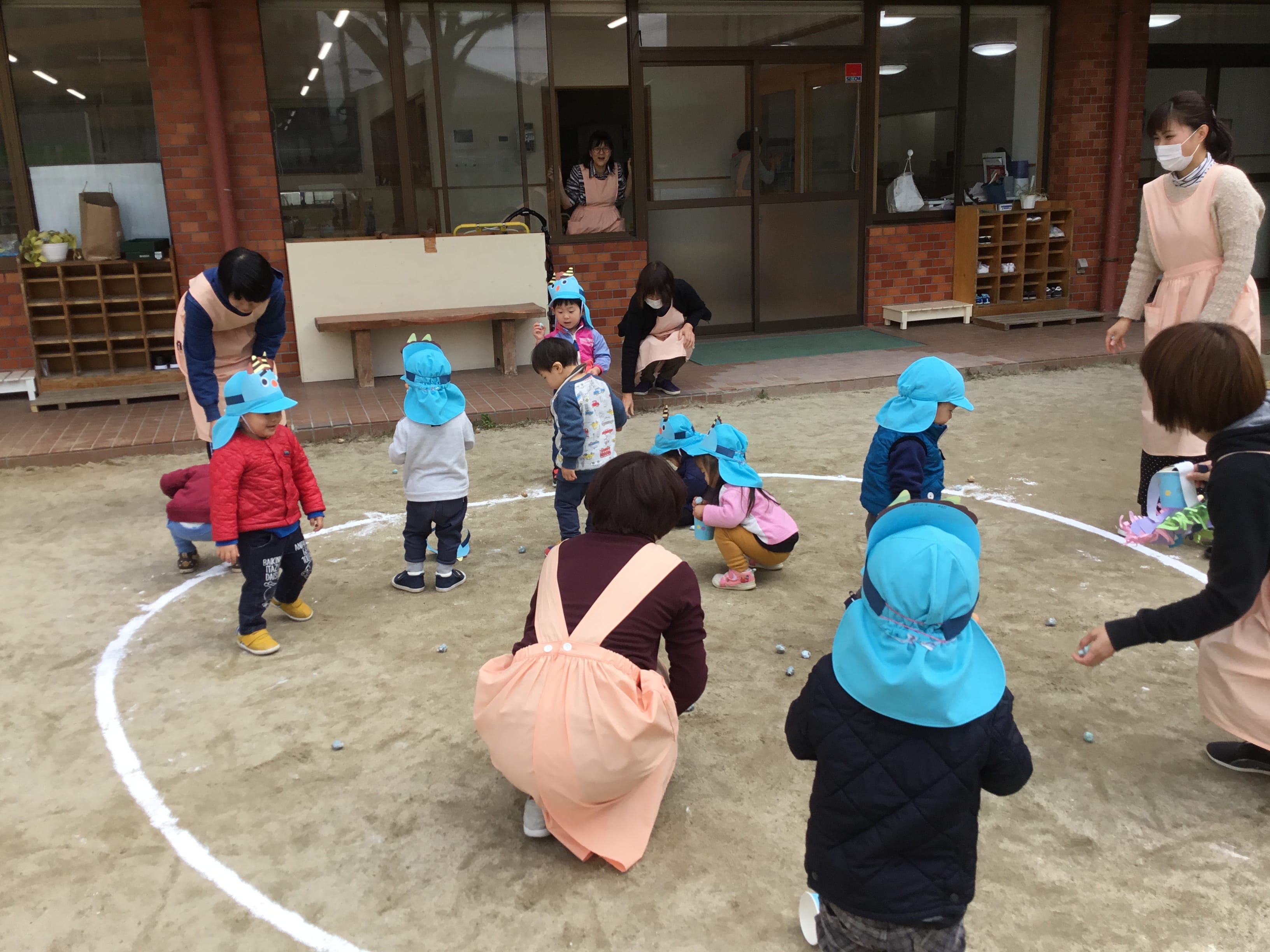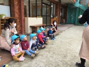 てれじあ組(2歳児)は公園に行き、幼稚園部のぱうろ組さんと豆まきをしました(*^-^*)