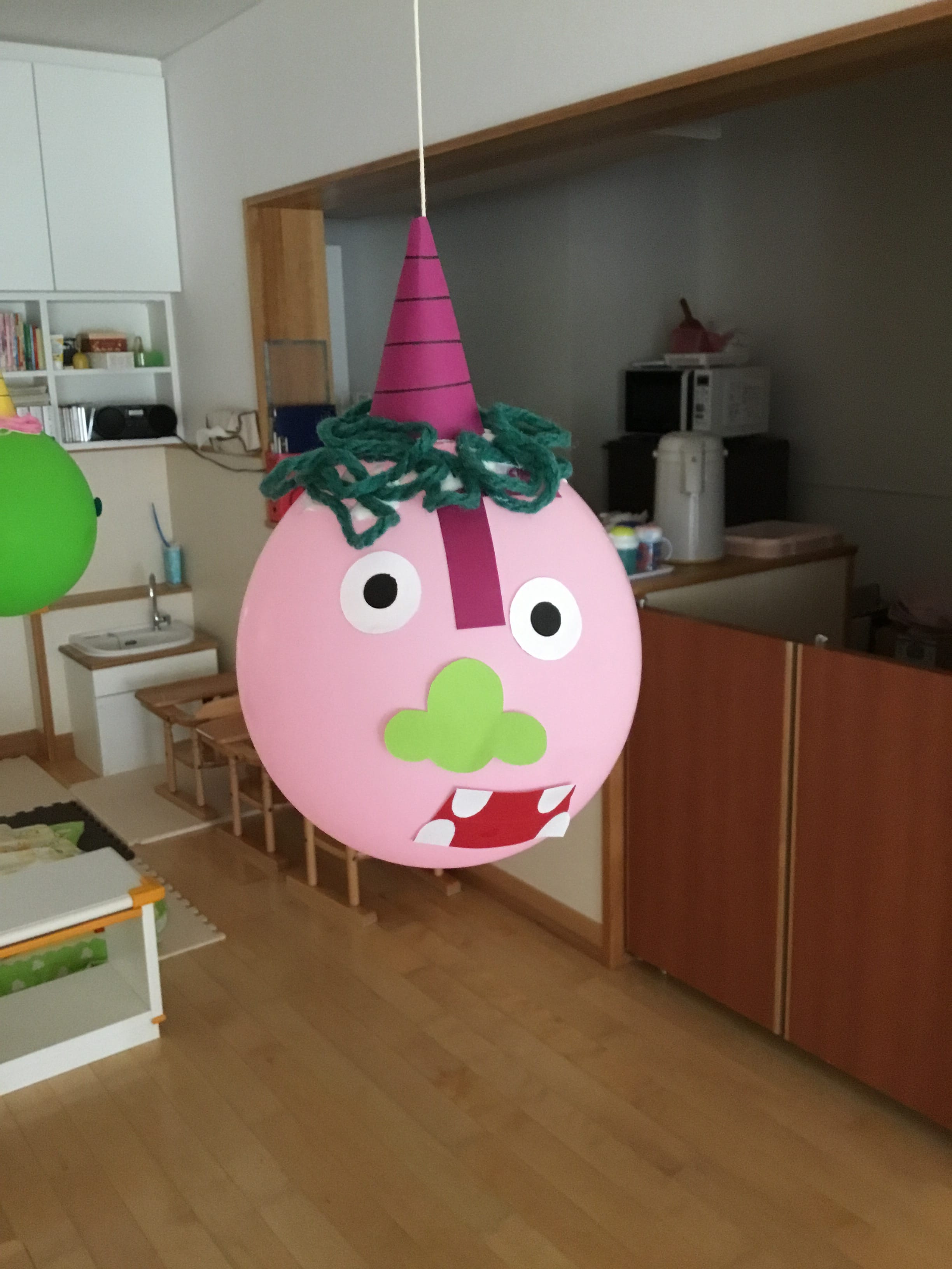 子どもたちが風船に鬼を作り、、、