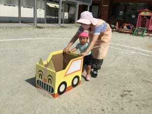 一生懸命猫バスを押すまりあ組の♡ちゃん(^^)