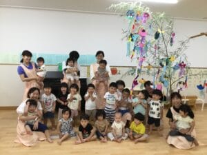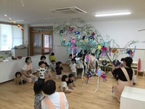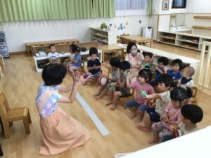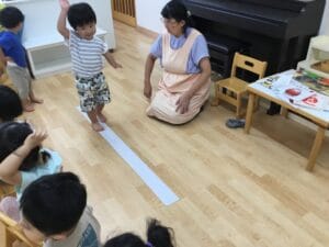 線上歩行…集中して歩いています。      おもちゃのチャチャチャに合わせて楽器遊び。
