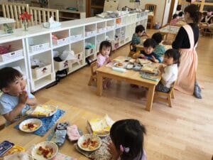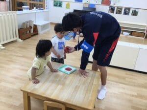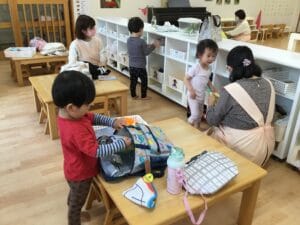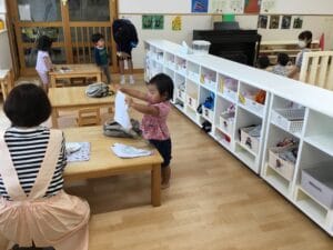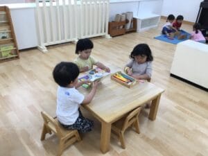 朝のお仕事の時間。絵本、パズル、スナップ止め。