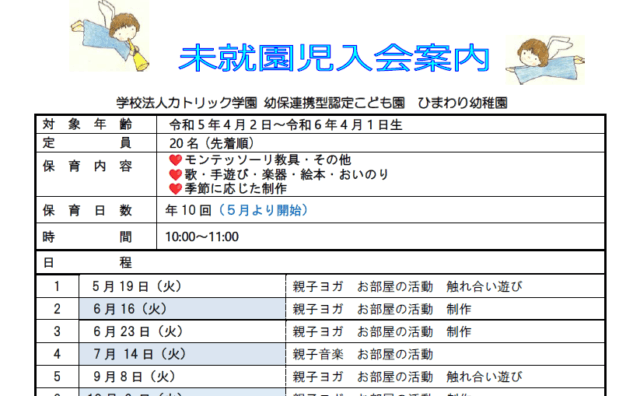 トピックス令和7年度 未就園児入会案内 令和7年3月17日から受付スタート入園前に幼稚園の生活を体験してみませんか?親子で一緒に歌ったり、制作をしたり、楽しく過ごしましょう♫ 対象年齢 令和4年4月2日~令和5年4月1日生まれのお子様と保護者 募集人数 定員20名(定員になり... 2025.03.08トピックス