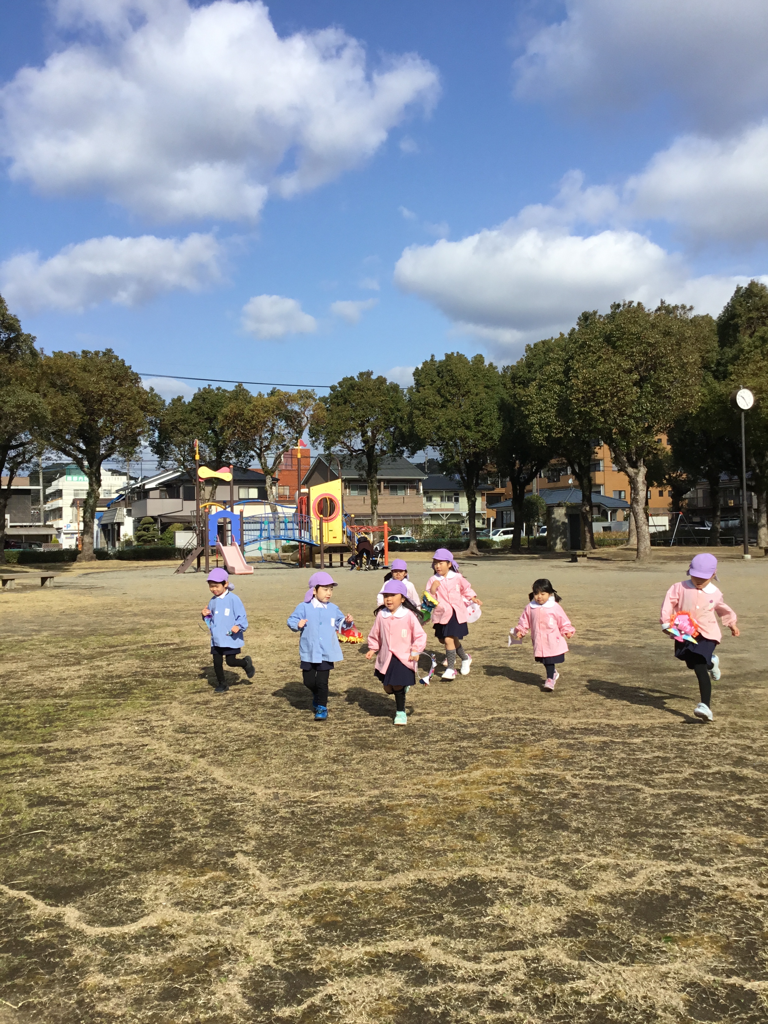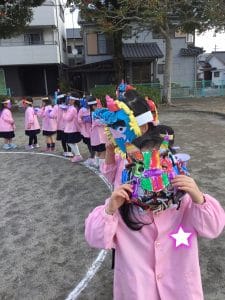 良いお天気のなかそれぞれのお面とつのこうばこを