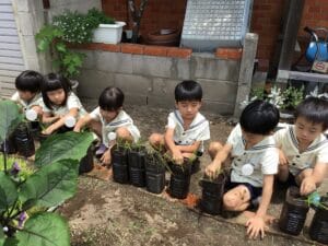 今年もA組さんがペットボトルを用いた自分だけの田んぼに稲を植えました。