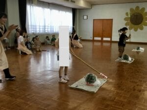 園に帰ってから調理までの間に、スイカ割り大会です♫